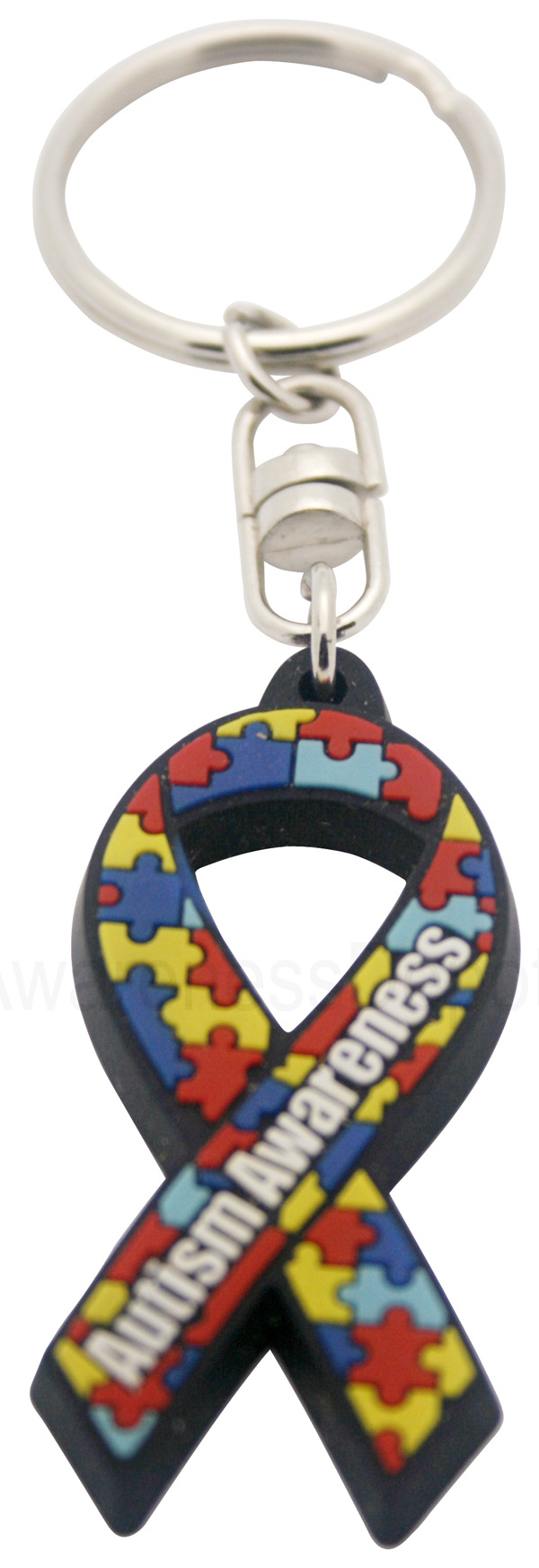 Autism Awareness Key Tag: 2 Dimensional - One of our best sellers!!! Great for fundraising events. Raised letters Soft PVC material (rubber) 2" x 1" with spindle. Each autism key tag is individually poly bagged. In stock same day shipping. Patent Pending.