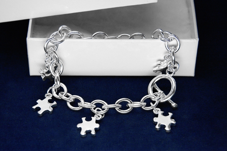 Our new Silver multi-puzzle piece Autism Charm Bracelet is a wonderful addition to any wardrobe. This sterling silver plated bracelet is stunning. The bracelet has a chunky silver chain with little puzzle piece charms hanging off of it. This bracelet is approx 9 inches. Each autism bracelet comes with a gift box with cotton insert.