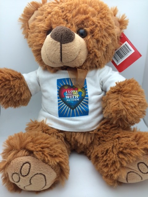 Autism Teddy Bear "I Love Someone with Autism" stuffed animal. This cute bear makes a perfect huggable gift. It is 8" high and 6" across. It is light and fluffy. The bear is made and stuffed with 100% polyester. The T-shirt reads "I Love Someone with Autism".