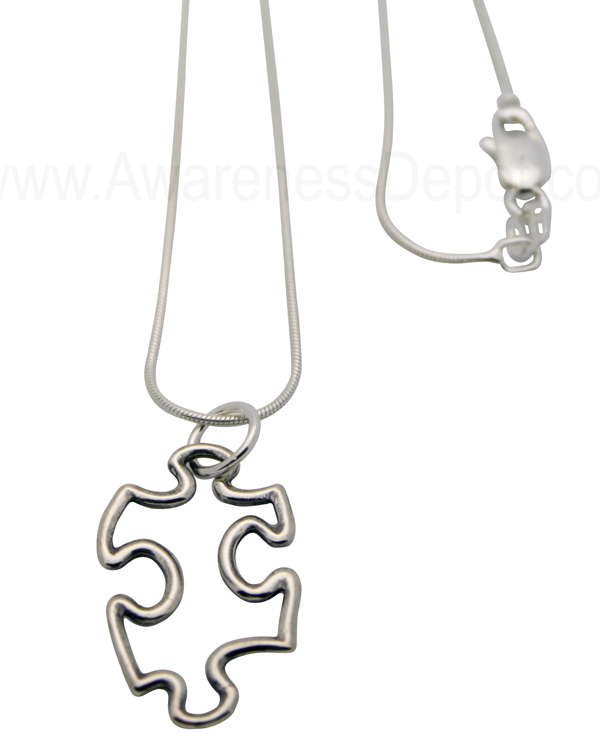 Sterling Silver Puzzle Link Necklace. The link is .925 Sterling Silver. Measurements: Length 25mm, Width 15mm. .925 Sterling Silver 1mm snake chain is 18 inches long and is brilliant and shiny. Has a safety lobster claw clasp. Made in USA.
